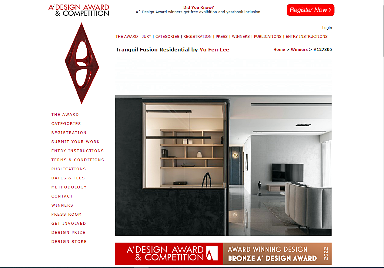 域建設計作品‧大硯二宅於2022年義大利A' Design Award and Competition室內設計大賽中斬獲銅獎殊榮,在這後疫情壓抑氛圍的時期裡,是件值得歡慶的事。