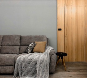 其二是兩扇木質蘊味的隱藏門,隱藏於質感沙發兩側。門扉之後就是精緻的臥室。